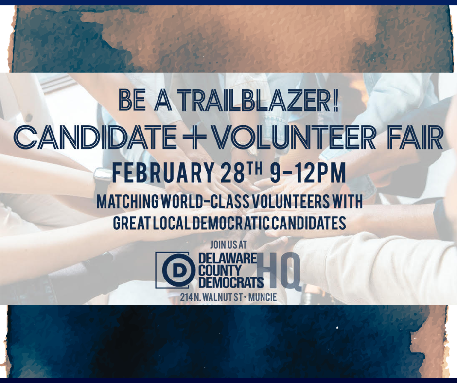 Join the Delaware County Democrats tomorrow at Democratic Headquarters for a Candidate & Volunteer Fair. Approximately 15 candidates will be on hand to share information about their campaigns and connect with community members interested in volunteering. Stop by, learn more, and feel free to bring a friend or neighbor.